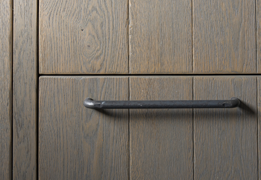 “Bij een landelijke keuken passen stevige grepen,” vertelt Gerrit. “Zoals dikke stangen of grove knoppen van staal of gietijzer.”