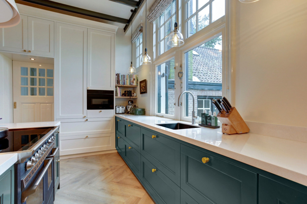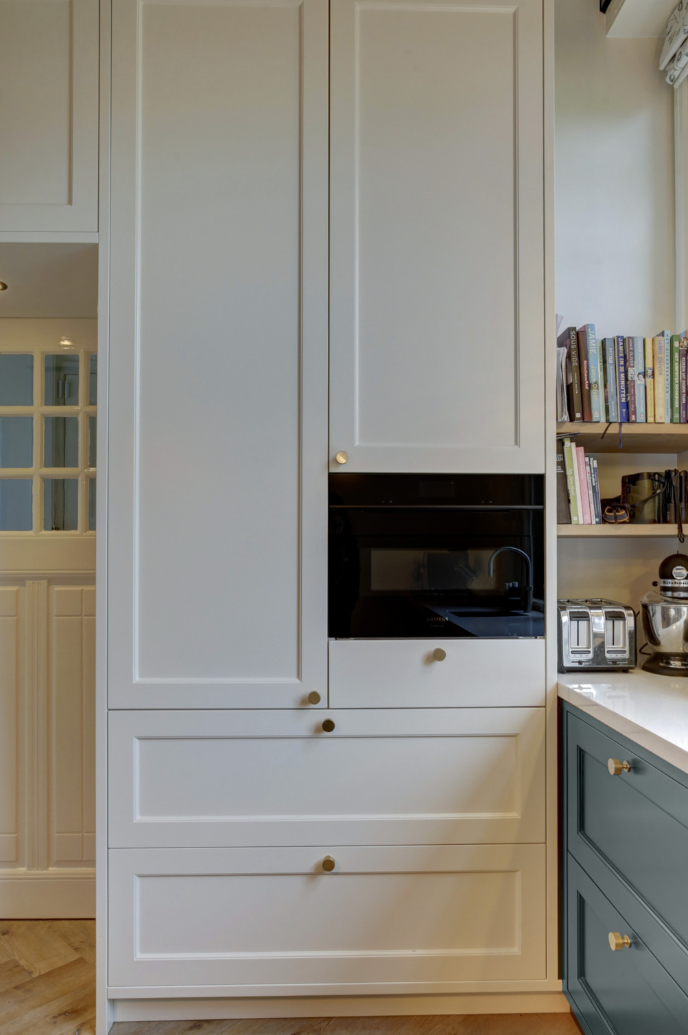 Het gezin wilde een nieuwe keuken die niet ultramodern was en aansloot bij de stijl van hun huis. Wij ontwierpen een keuken die perfect balanceerde tussen modern en traditioneel. De keuken is niet te strak, maar biedt wel alle moderne functionaliteiten. Voorheen kwam je het huis binnen en stond je meteen in de keuken, maar nu biedt een kastenwand een praktische en stijlvolle overgang naar de keukenruimte. De kaderfronten zijn zorgvuldig gelakt in kalme kleuren, wat zorgt voor een stijlvolle en rustige uitstraling.