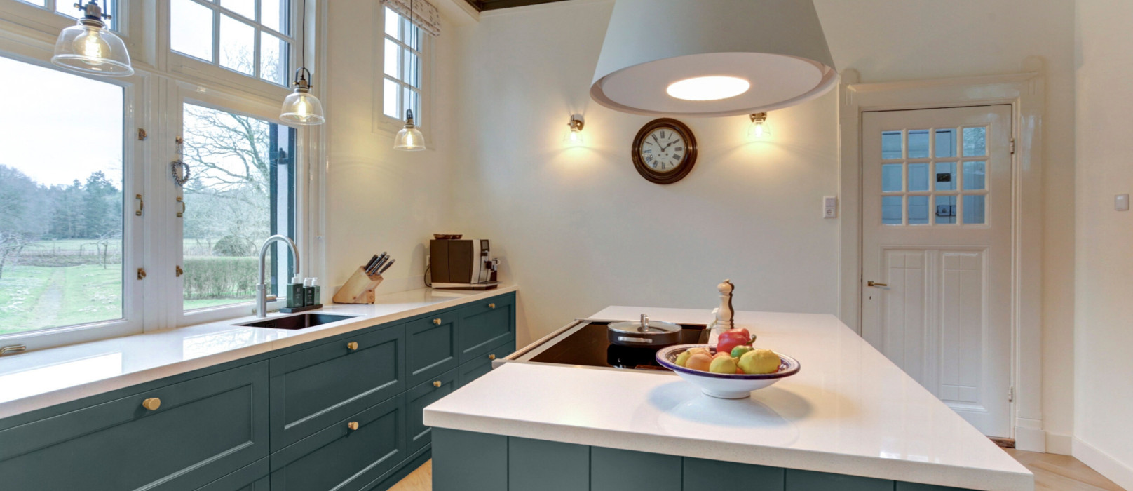 Het composieten werkblad is robuust en onderhoudsvriendelijk, terwijl het ook een verfijnde, luxe uitstraling aan de keuken geeft. Een bijzonder element is de afzuigkap van Wave Design, die tevens als lamp fungeert. Dit voegt een stijlvol en uniek detail toe aan de keuken. Het gezin heeft nu een keuken die perfect aansluit bij hun nieuwe inrichting en levensstijl, waar ontwerp en functionaliteit samenkomen in een robuuste en landelijke stijl.