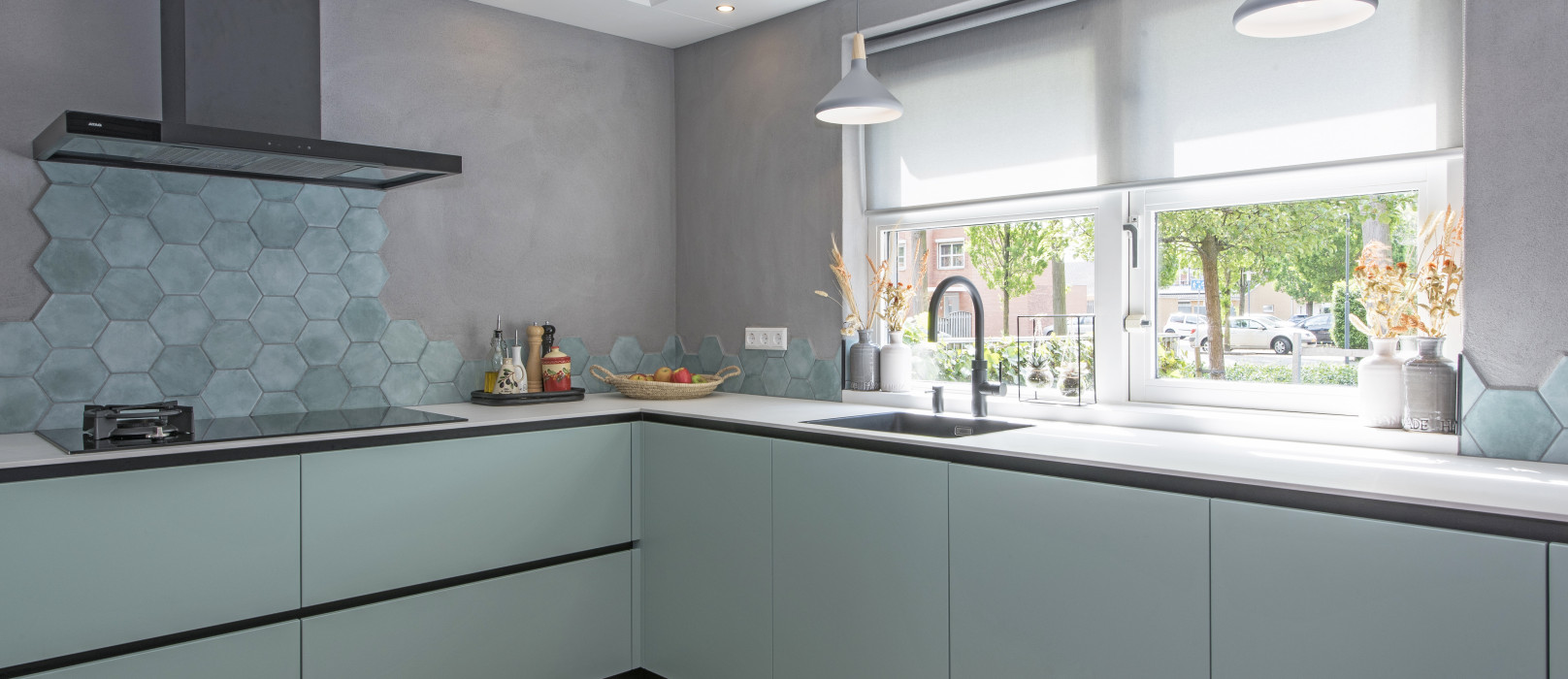 De achterwand van de keuken is betegeld met opvallende hexagon tegels. Deze tegels geven de ruimte een eigentijdse en unieke uitstraling. De organische vormen en de zachte groene tinten van de tegels vormen een harmonieus geheel met de rest van het ontwerp.