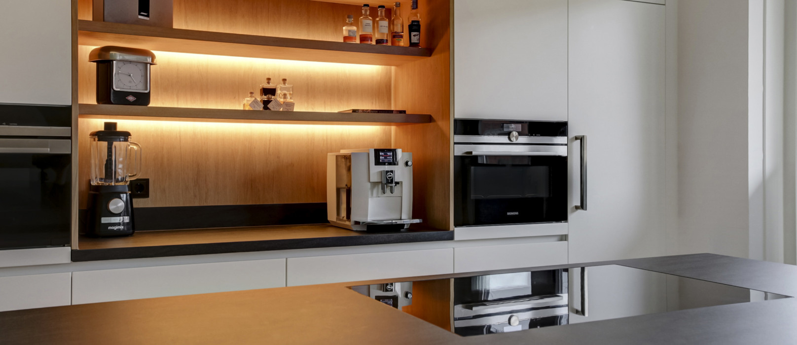 Een bijzonder detail in deze keuken is de koffienis. Afgewerkt met eikenfineer en behandeld met monocoat, voegt deze nis een warme, natuurlijke tint toe aan de keuken. De indirecte LED-verlichting zorgt voor een sfeervolle ambiance, waardoor de nis zowel praktisch als decoratief is.