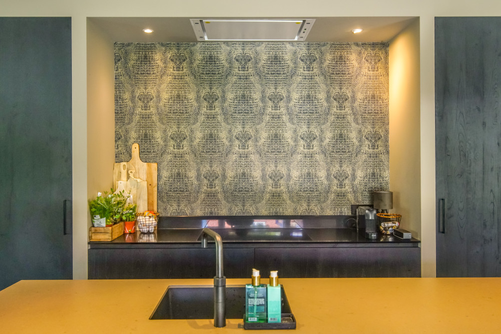 De keuken werd strak vormgegeven en kreeg dankzij de zorgvuldig gekozen materialen en kleuren een chique uitstraling. Deze keuken is het verzamelpunt van de woning, waar gedurende de dag alles gebeurt.